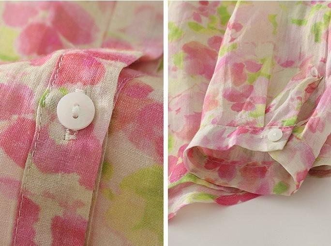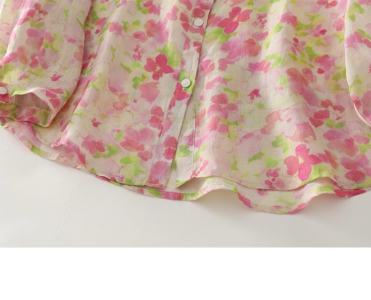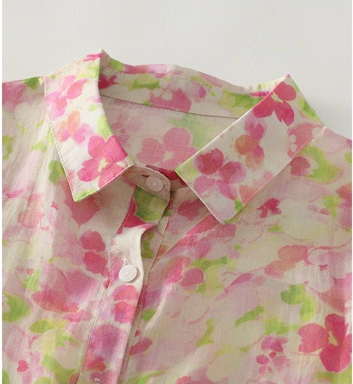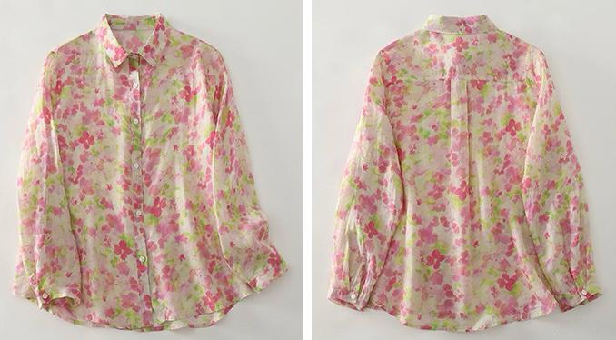 Embrace effortless elegance with this pastel floral sheer shirt. Featuring a soft blend of pink and green watercolor-style florals on a light off-white base, this button-down shirt is perfect for adding a feminine touch to your everyday look. The lightweight, breathable fabric ensures all-day comfort, while the classic collar and relaxed fit make it ideal for layering or wearing on its own. Perfect for brunches, vacations, or casual day outs, pair it with denim or flowy skirts for a fresh and breezy style.